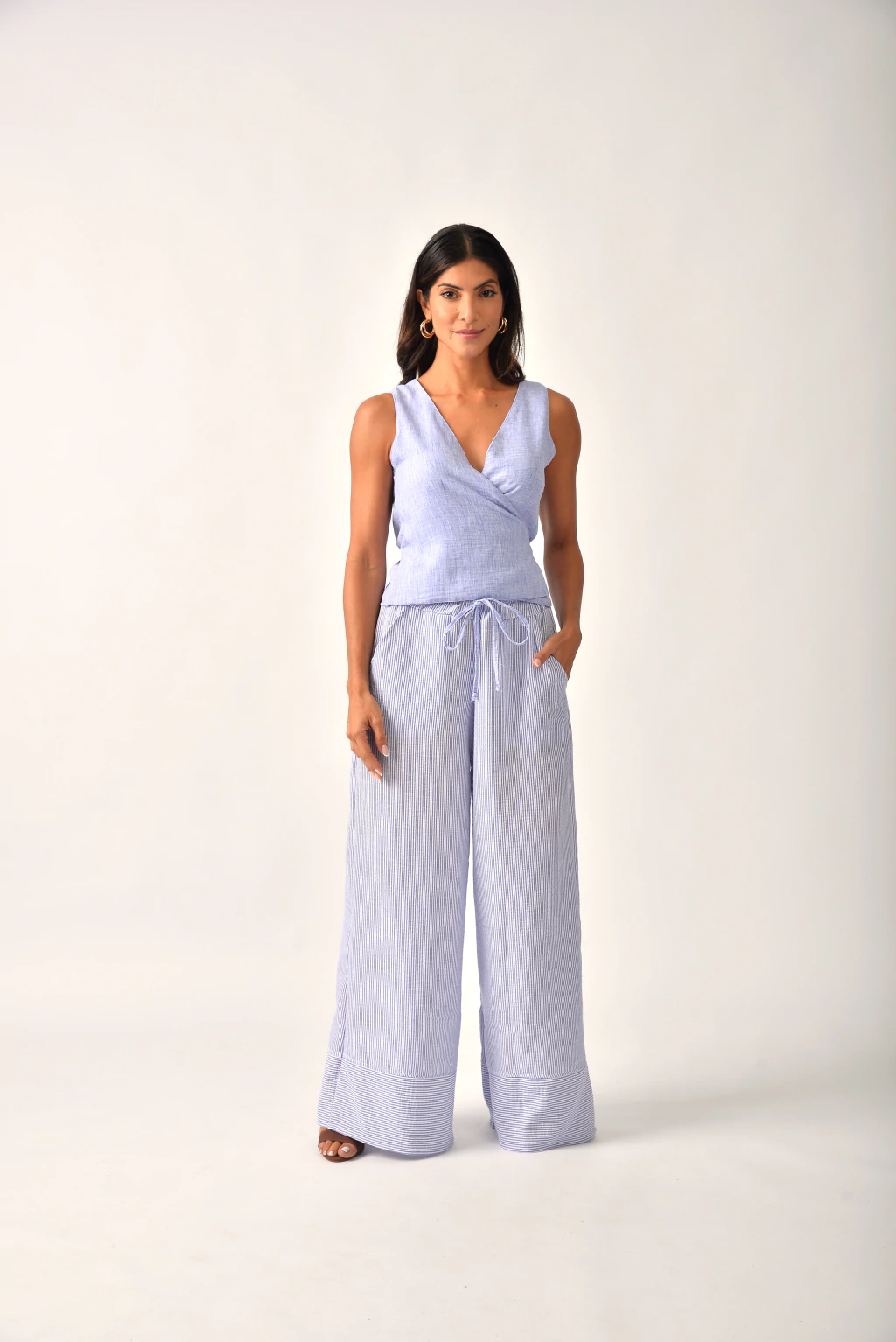 Blusa estilo colete transpassado com listras finas. Com design leve e sofisticado, traz amarração lateral que valoriza a silhueta e decote em V que alonga o colo. Perfeito para compor looks frescos e elegantes nos dias mais quentes.