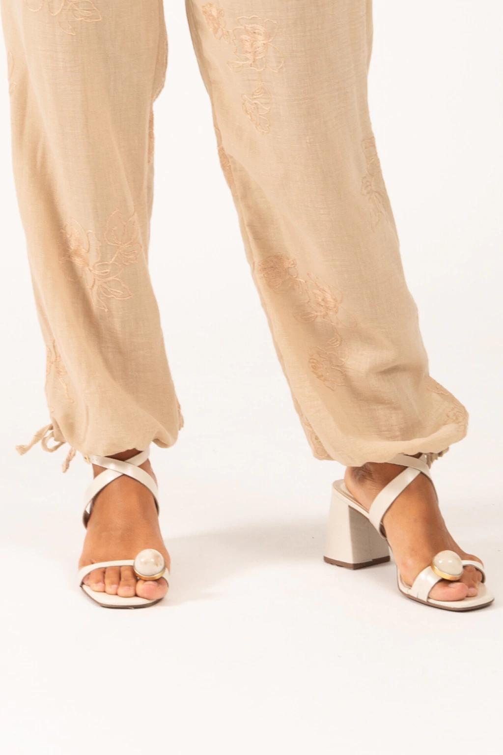 A calça possui modelagem reta e cintura média, garantindo conforto sem perder o estilo. O tecido texturizado com estampa floral sutil adiciona charme à peça, enquanto as amarrações no tornozelo deixam o visual moderno e descontraído. Ideal para quem busca elegância com leveza. Aproveite para combinar com a Regata e Calça Bordadas Sorte Areia!