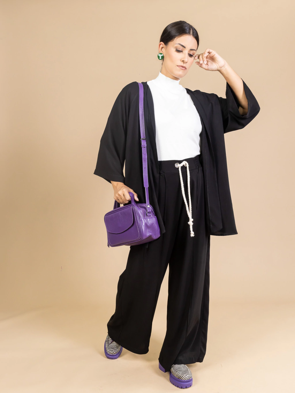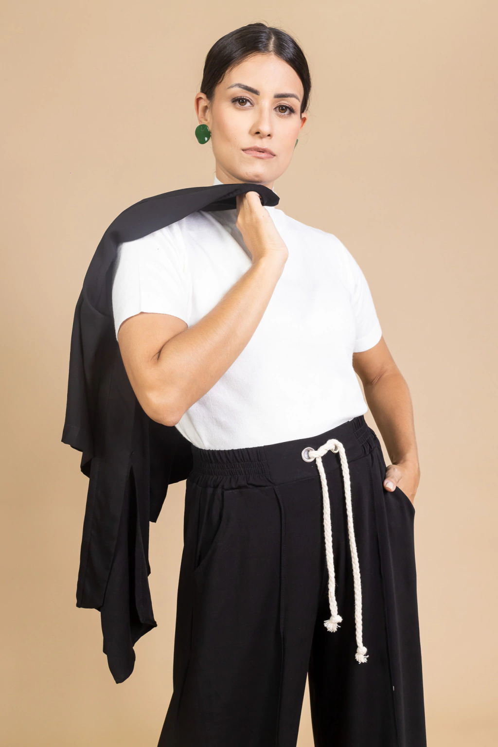 A Calça Cheia de Graça é uma pantalona com uma nervura na frente, bolsos e detalhe de amarração com corda (disponível apenas com a corda na cor *preta*)