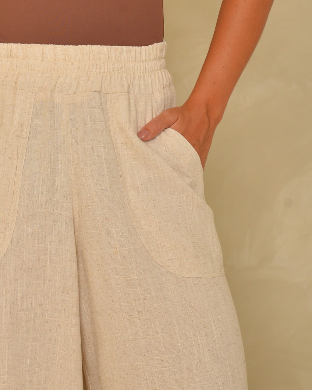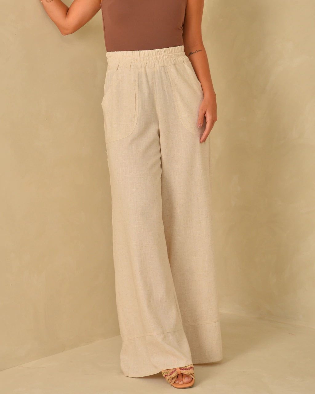 Calça pantalona leve e fluida, com bolsos laterais e elástico na cintura para um ajuste confortável e prático. Seu caimento solto e elegante oferece liberdade de movimento, tornando-a perfeita para looks casuais ou mais refinados, com um toque de estilo e versatilidade