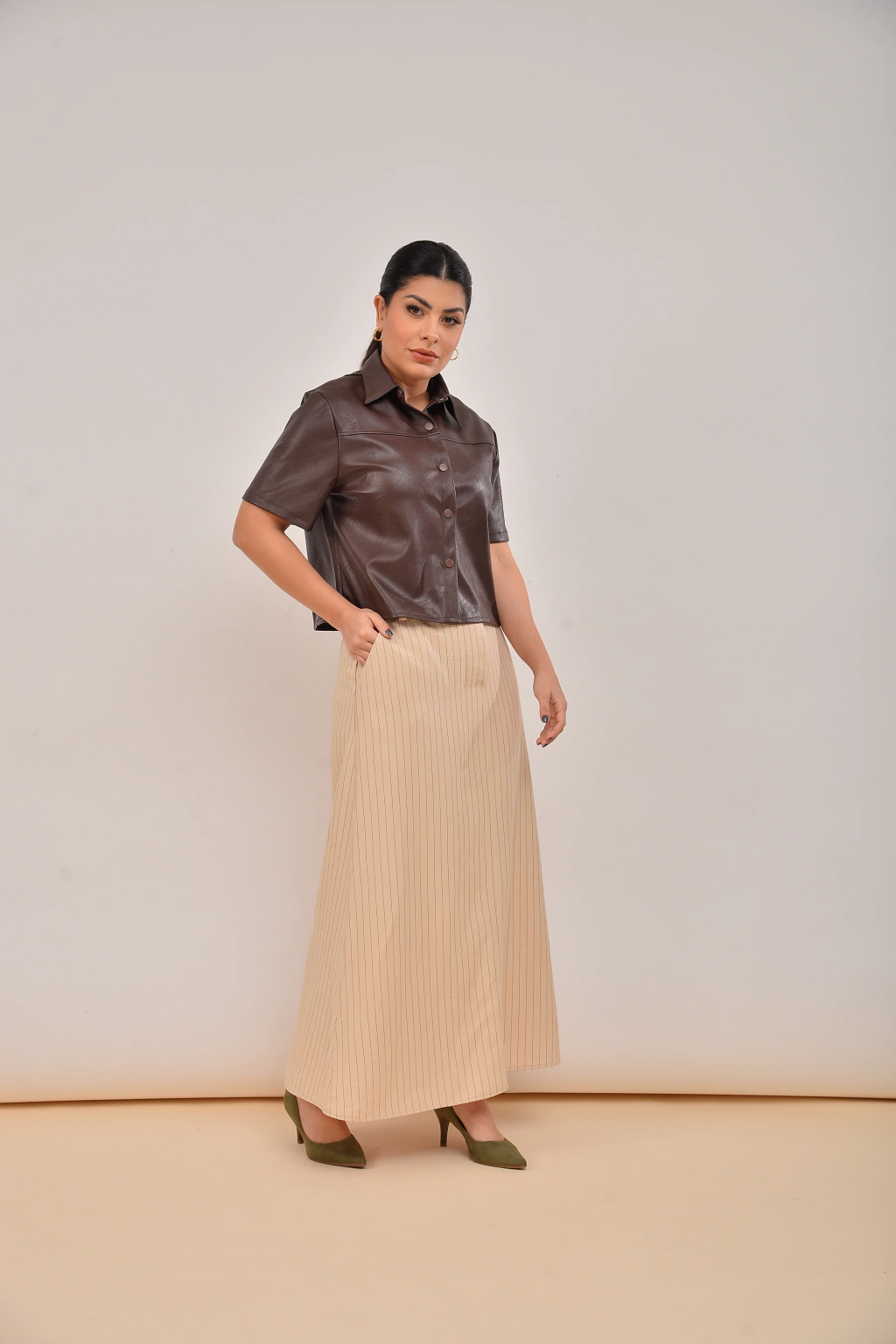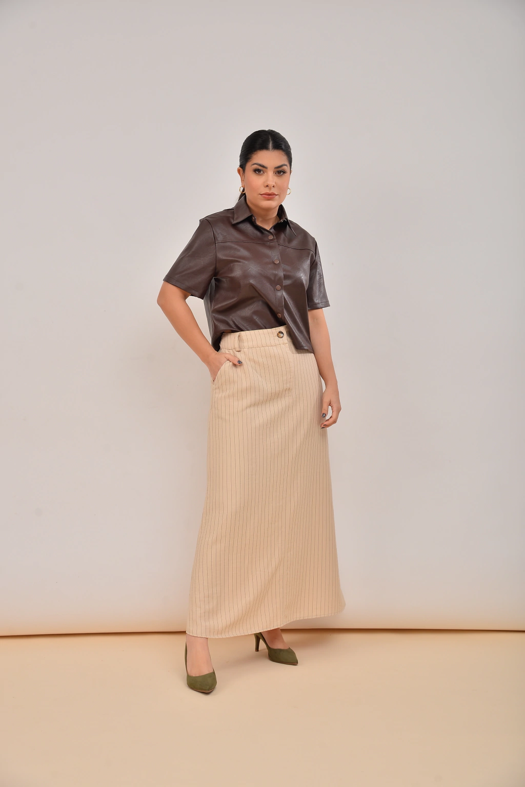 A saia é uma queridinha nessa coleção. A modelagem é gode, com fechamento em zíper e botão no cós.