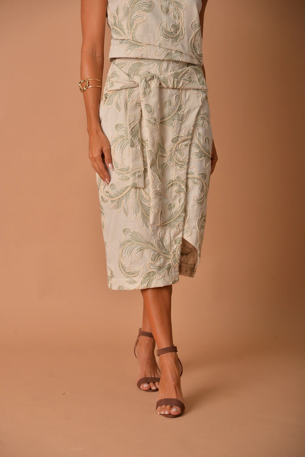 Conjunto sofisticado com camiseta de zíper lateral, trazendo um toque moderno e ajustável. A saia destaca-se pelo detalhe de amarração na cintura e repartição frontal, que adiciona elegância e movimento. Perfeito para quem busca conforto com um toque de sofisticação.