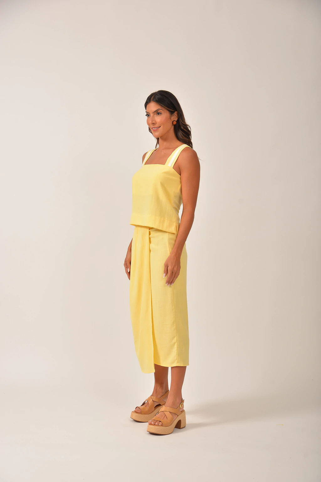 Conjunto em tecido leve composto por regata de alças com detalhes, e decote reto, combinada com saia longa de modelagem reta e fendas laterais que garantem movimento e conforto.