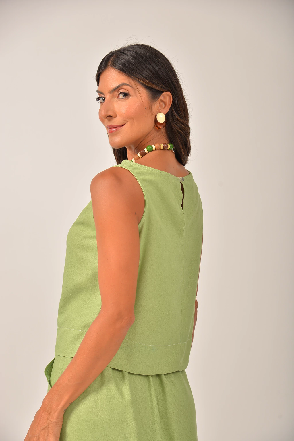 Conjunto sofisticado com regata de detalhe delicado: um botão nas costas que adiciona um toque de charme sutil. A saia traz uma fenda frontal que confere movimento, com elástico na cintura para conforto e uma amarração que valoriza a silhueta. Uma combinação perfeita de elegância e praticidade, ideal para diversas ocasiões.