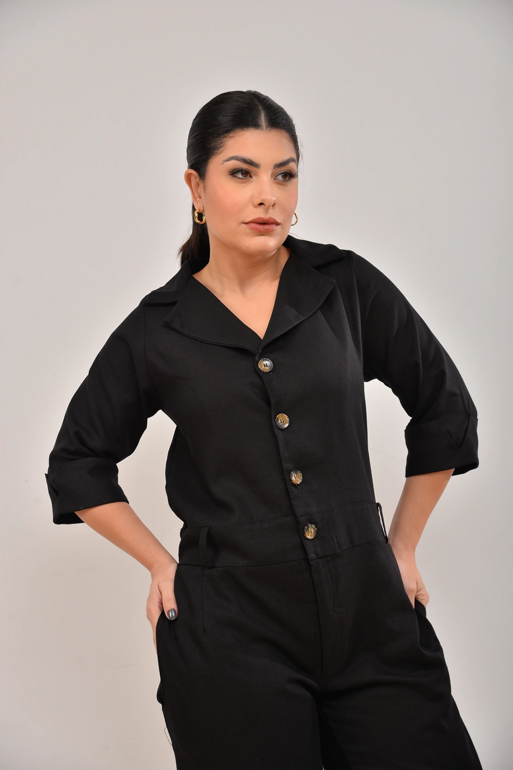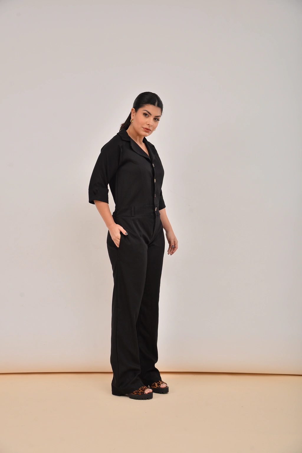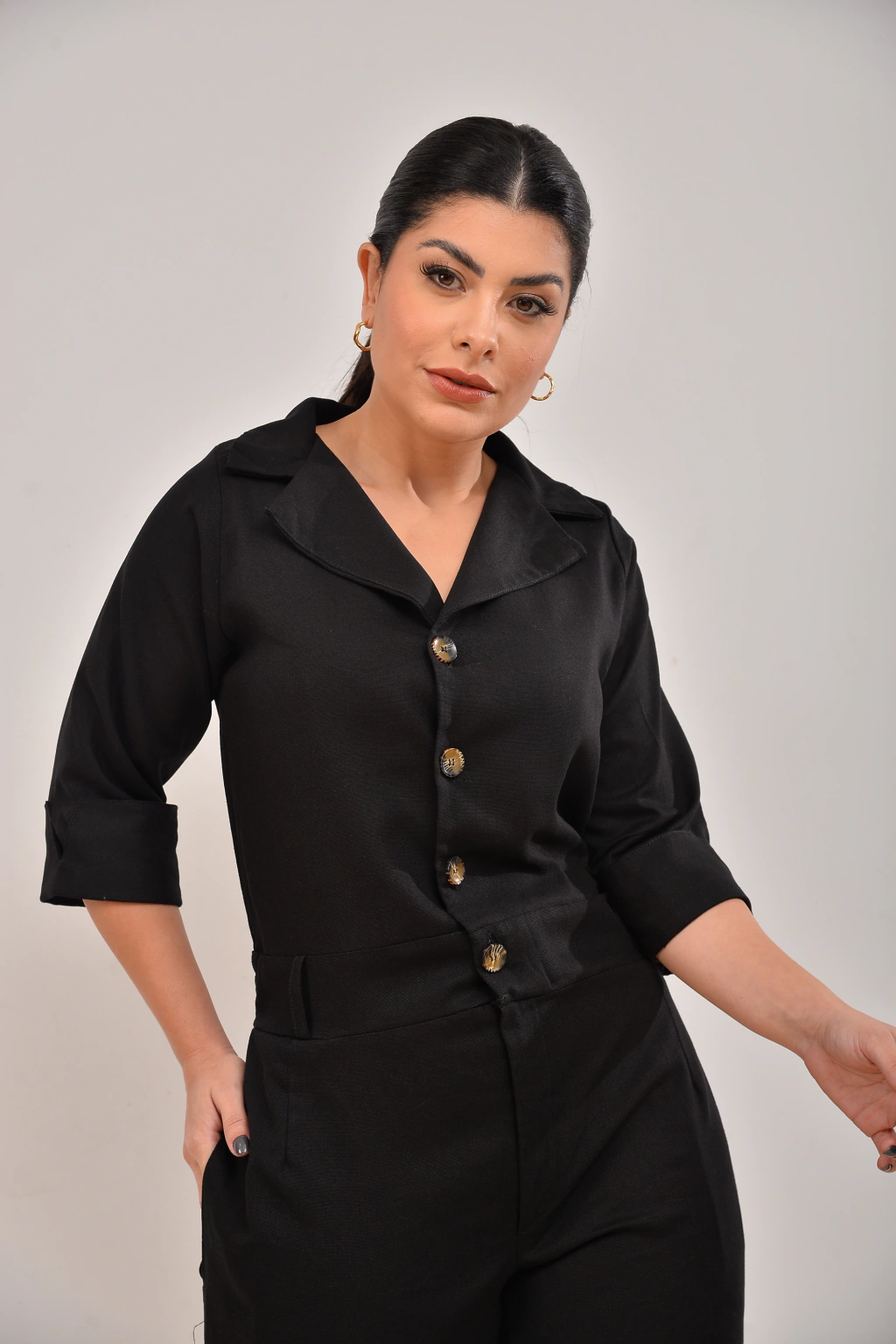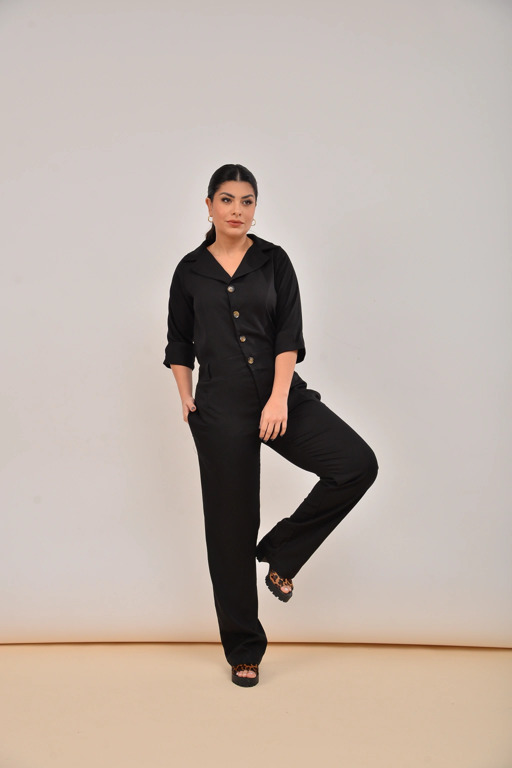 O Macacão tem abotoamento na parte da blusa e zíper na calça. Manga 3/4 e gola de blazer.