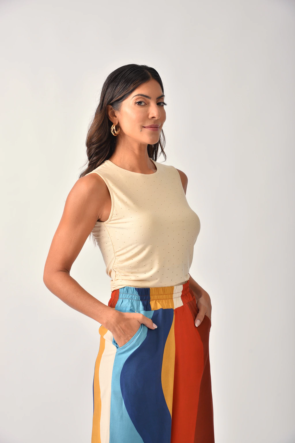 Camiseta regata com micro furos para estilo, modelagem reta e toque macio. Versátil e delicada, perfeita para compor looks casuais com charme.