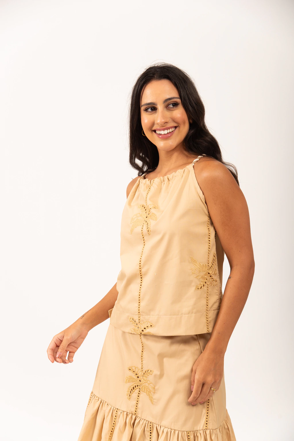 A regata possui modelagem soltinha e decote com leve franzido, criando um caimento delicado e confortável. Confeccionada em tecido leve, ela traz bordados tropicais em tom sobre tom que adicionam charme artesanal à peça. As alças completam o visual fresco e elegante, ideal para dias quentes e composições descontraídas. Aproveite para combinar com a Saia Sublime Bege!