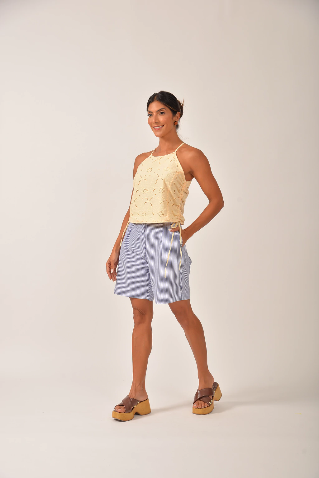 Com alças finas e modelagem reta com amarrações nas laterais, a peça une conforto e estilo, perfeita para composições casuais, garantindo para um visual moderno e harmonioso.