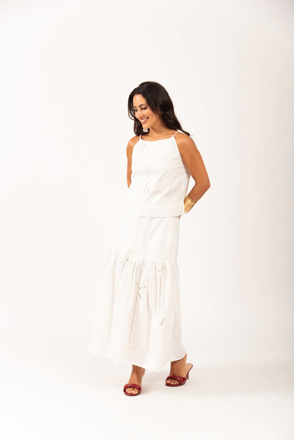 A saia midi apresenta cintura média e caimento fluido, valorizado pelo babado amplo que traz movimento e feminilidade. O tecido leve recebe bordados tropicais distribuídos ao longo da peça, criando um visual harmonioso e sofisticado. Versátil e confortável, é perfeita para criar looks casuais chic ou composições mais elaboradas. Aproveite para combinar com a Regata Sublime Branca!