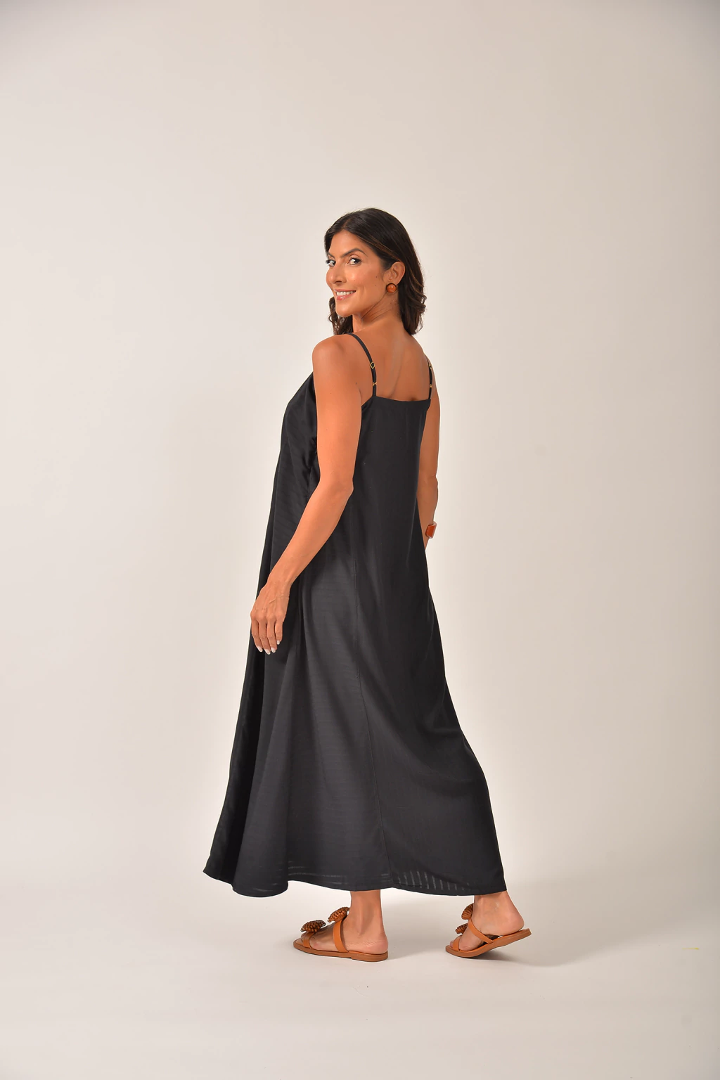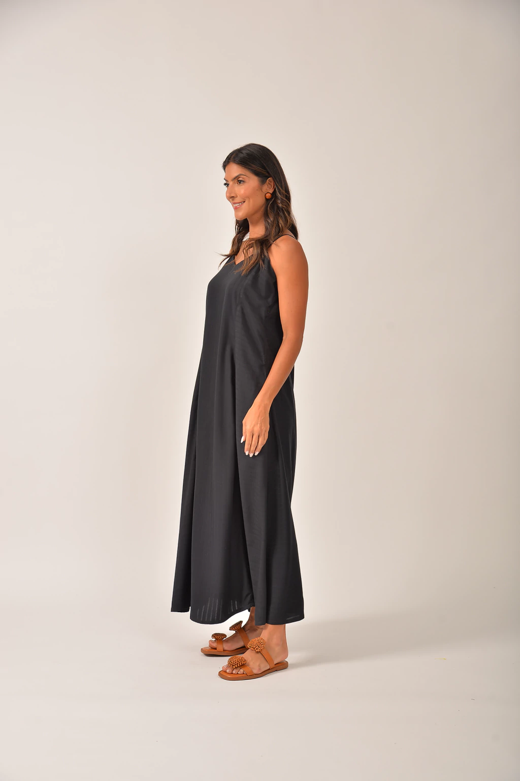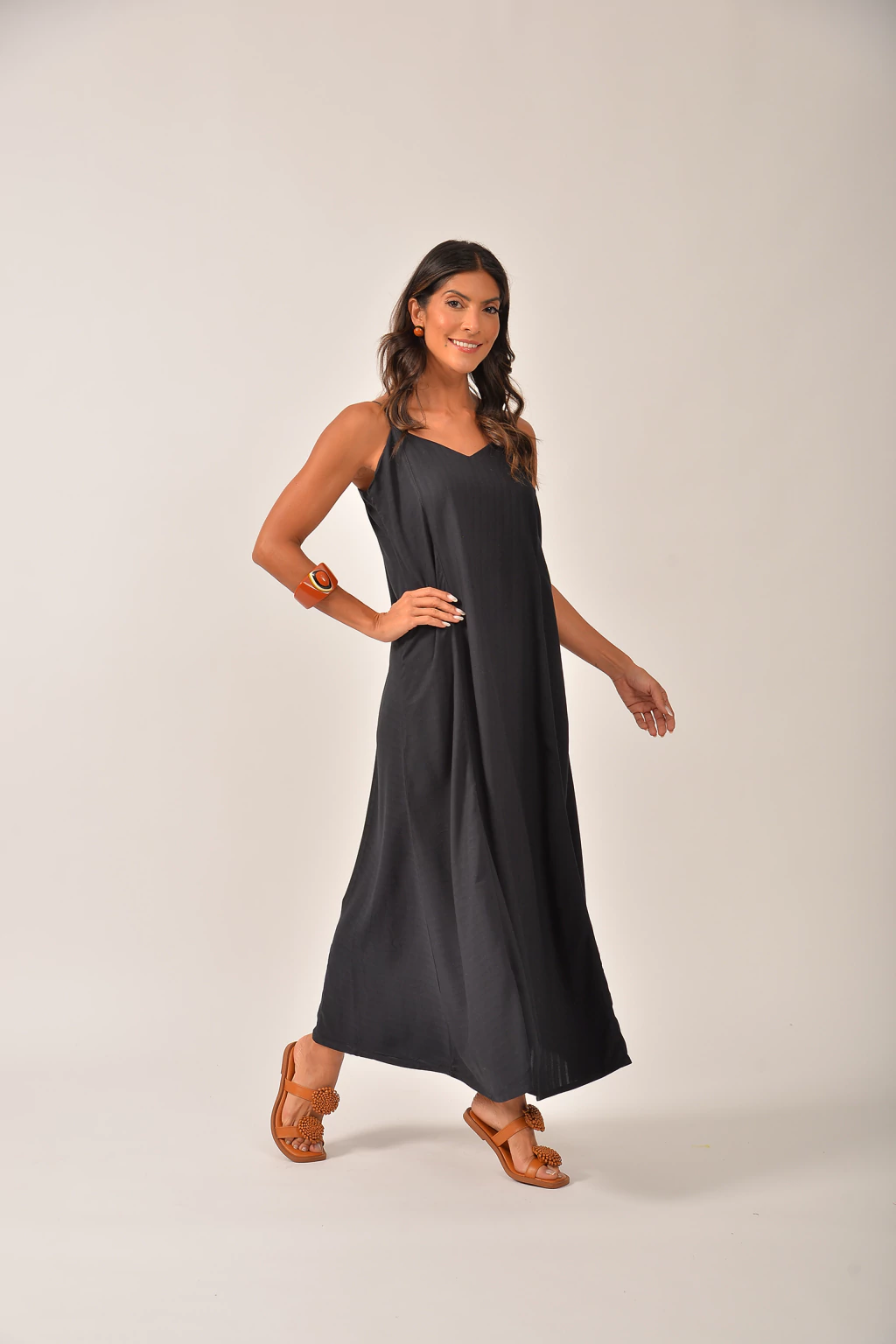 Vestido longo liso, de modelagem reta e fluída, que valoriza a silhueta com leveza e elegância. Confeccionado em tecido leve, é uma peça versátil e atemporal, perfeita para compor looks sofisticados do dia à noite.