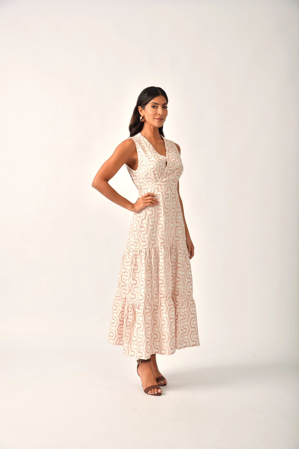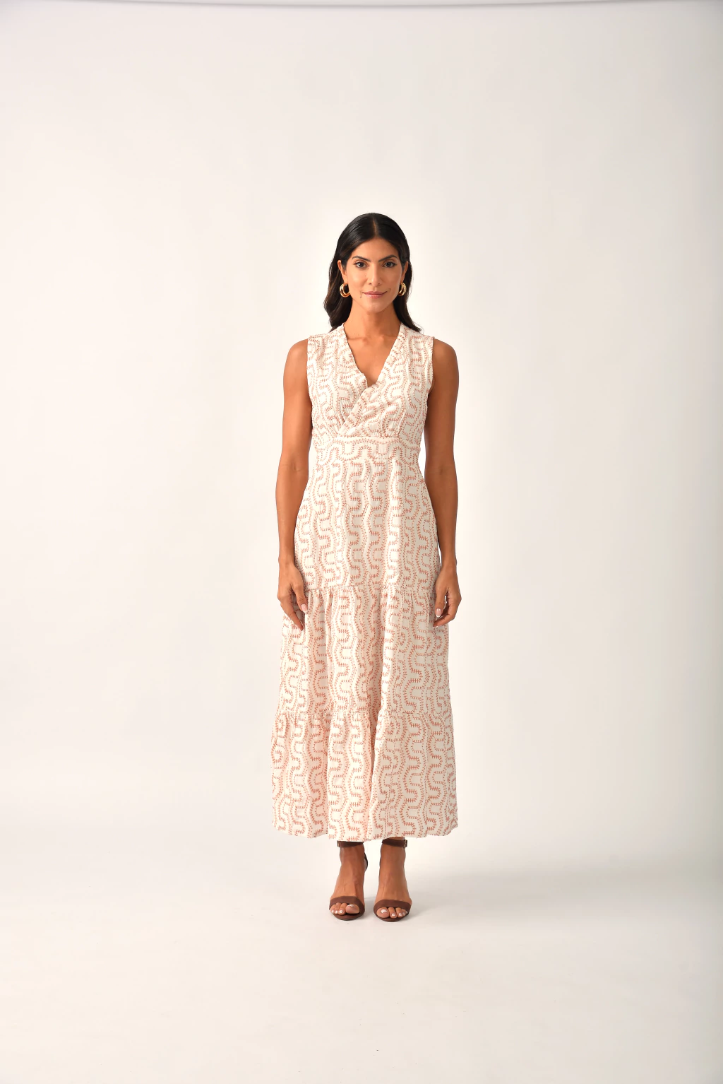 Vestido longo em tecido leve com estampa delicada, decote transpassado e cintura marcada. Elegante e versátil, é perfeito para dias ensolarados e ocasiões especiais com um toque de sofisticação natural.